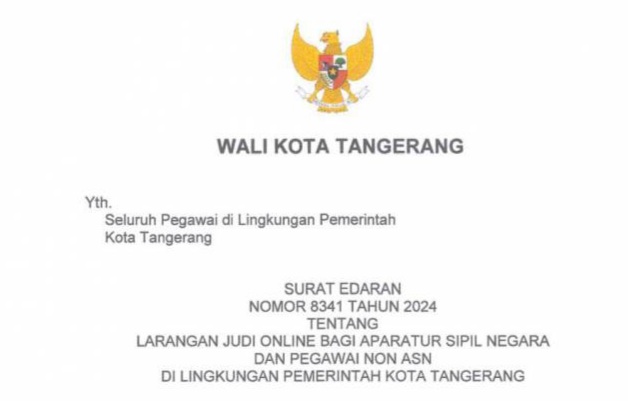 Dalam upaya menciptakan lingkungan kerja yang bersih dan produktif, Pemerintah Kota (Pemkot) Tangerang mengeluarkan Surat Edaran (SE) Wali Kota Nomor 8341 Tahun 2024, tentang Larangan Judi Online kepada Pegawai Aparatur Sipil Negara (ASN) dan Pegawai Non ASN di Lingkungan Pemerintah Kota Tangerang.