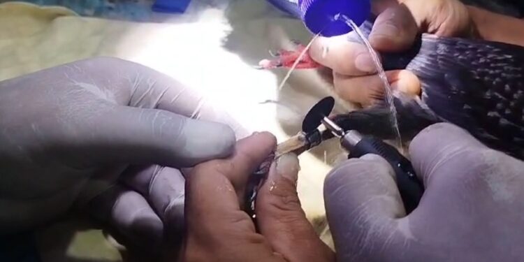 Ia pun menjelaskan, petugas perlahan memotong cincin dengan hati-hati sambil menggunakan air. Akhirnya, petugas melepas cincin dari kaki burung merpati tersebut dalam kurun waktu 15 menit.