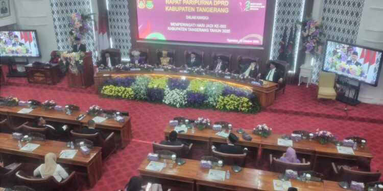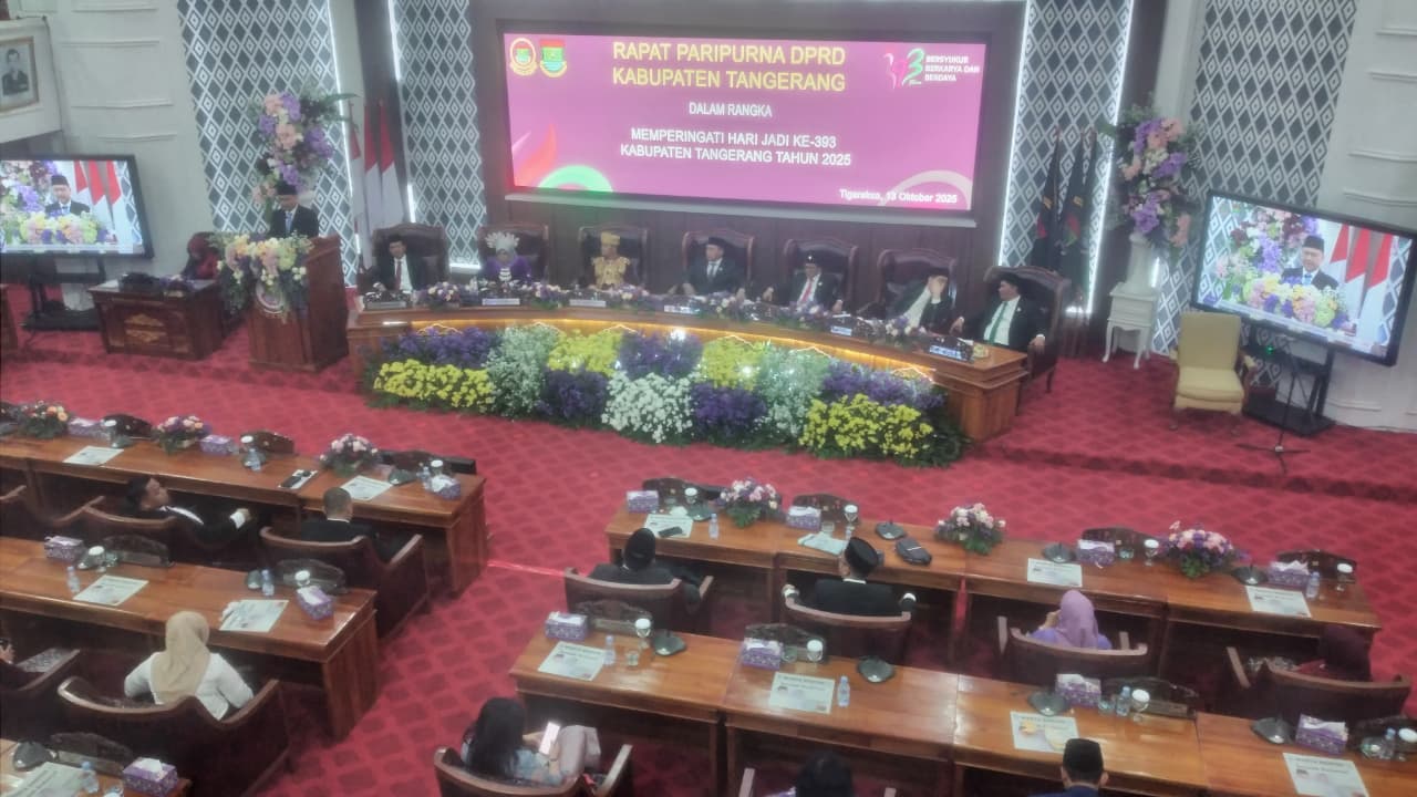 Redaksi Banten, Tigaraksa – Menyambut hari jadi ke-393 Kabupaten Tangerang, DPRD Kabupaten Tangerang menggelar Rapat Paripurna pada Senin, 13 Oktober 2025. Rapat dipimpin langsung oleh Ketua DPRD, Muhammad Amud, serta turut dihadiri Bupati Tangerang Maesyal Rasyid dan Wakil Bupati Intan Nurul Hikmah.