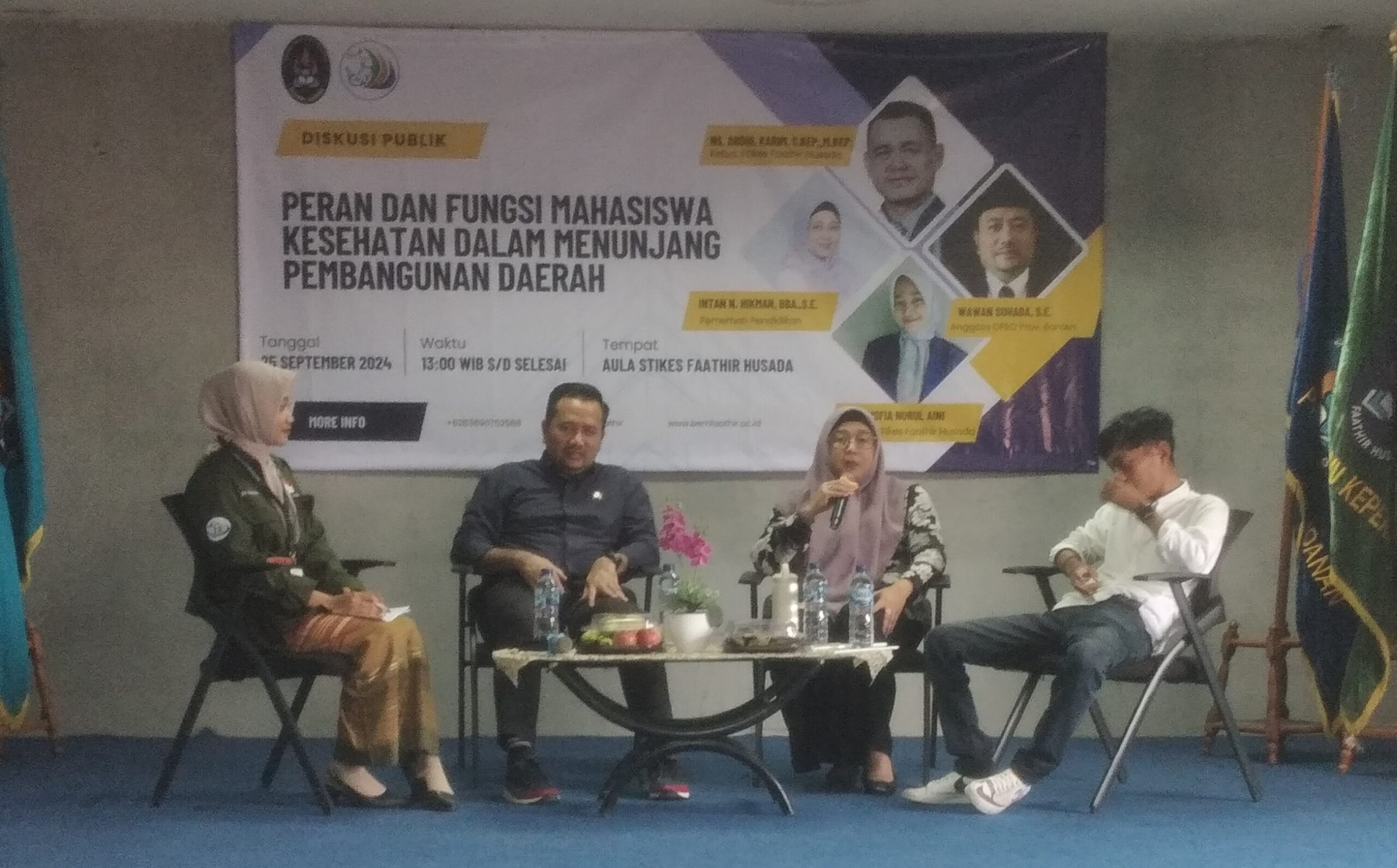 Hal ini disampaikan oleh Intan Nurul Hikmah dalam acara diskusi publik yang digelar oleh Sekolah Tinggi Ilmu Kesehatan (STIKES) Faathir Husada, Balaraja, Kabupaten Tangerang dengan tema “Peran dan Fungsi Mahasiswa Kesehatan Dalam Menunjang Pembngunan Daerah”. Rabu (25 September 2024)
