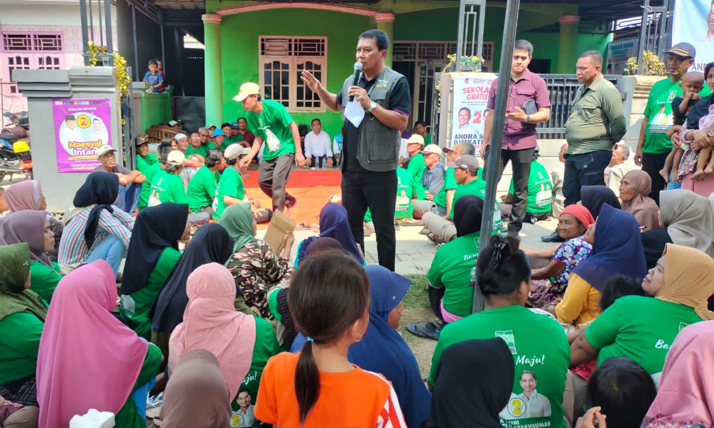 Dari pantauan, setelah acara penyambutan selesai, Maesyal Rasyid langsung menyapa para warga, duduk bersama di tengah-tengah ratusan masyarakat yang didominasi oleh kaum emak-emak untuk memaparkan visi misi dan program-program unggulan Maesyal Intan (Madani).