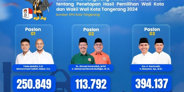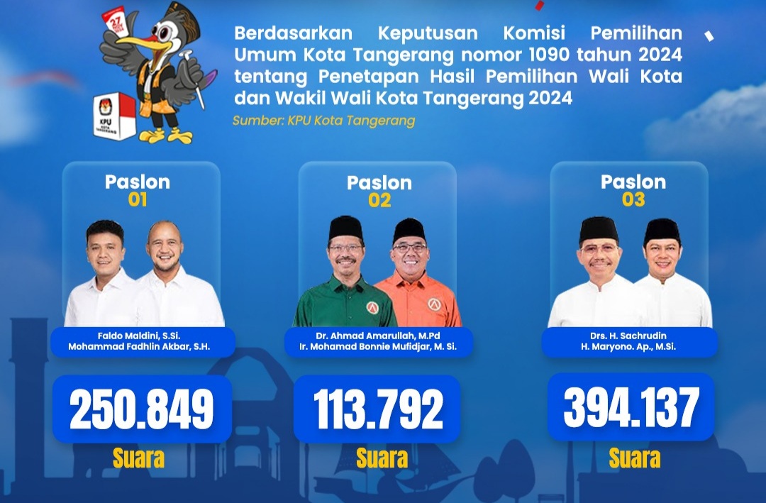 KPU juga telah mengeluarkan Keputusan KPU Kota Tangerang Nomor 1090 Tahun 2024 tentang Penetapan Hasil Pemilihan Wali Kota dan Wakil Wali Kota Tangerang 2024 berdasarkan rekapitulasi hasil perhitungan perolehan suara.