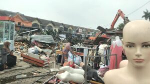 Pantauan di lokasi saat alat berat melakukan pembongkaran nampak pemandangan para pedagang berusaha mengamankan dan mengevakuasi barang dagangannya.