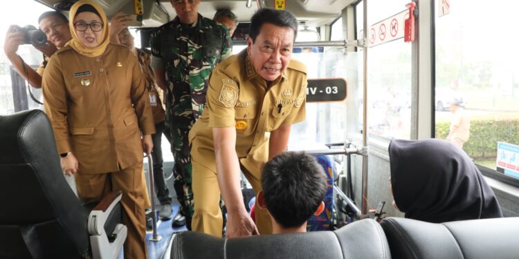 Redaksi Banten,–Pemerintah Kabupaten Tangerang resmi meluncurkan program ujicoba angkutan sekolah gratis untuk pelajar di wilayah Kabupaten Tangerang. Acara peluncuran program tersebut dilakukan langsung oleh Bupati Tangerang, Moch. Maesyal Rasyid, bersama Wakil Bupati Tangerang, Intan Nurul Hikmah di area Bizpoint, Kecamatan Cikupa. Selasa, (10/6/25).