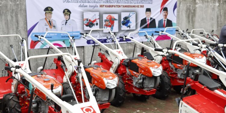 Redaksi Banten– Sejumlah kelompok tani di13 kecamatan di Kabupaten Tangerang mendapatkan bantuan 37 unit alat dan mesin pertanian (alsintan) untuk mendukung terhadap peningkatan produktivitas dan kesejahteraan petani. Adapun alsintan yang diserahkan terdiri dari 17 unit hand tractor, 10 unit power thresher, dan 10 unit cultivator