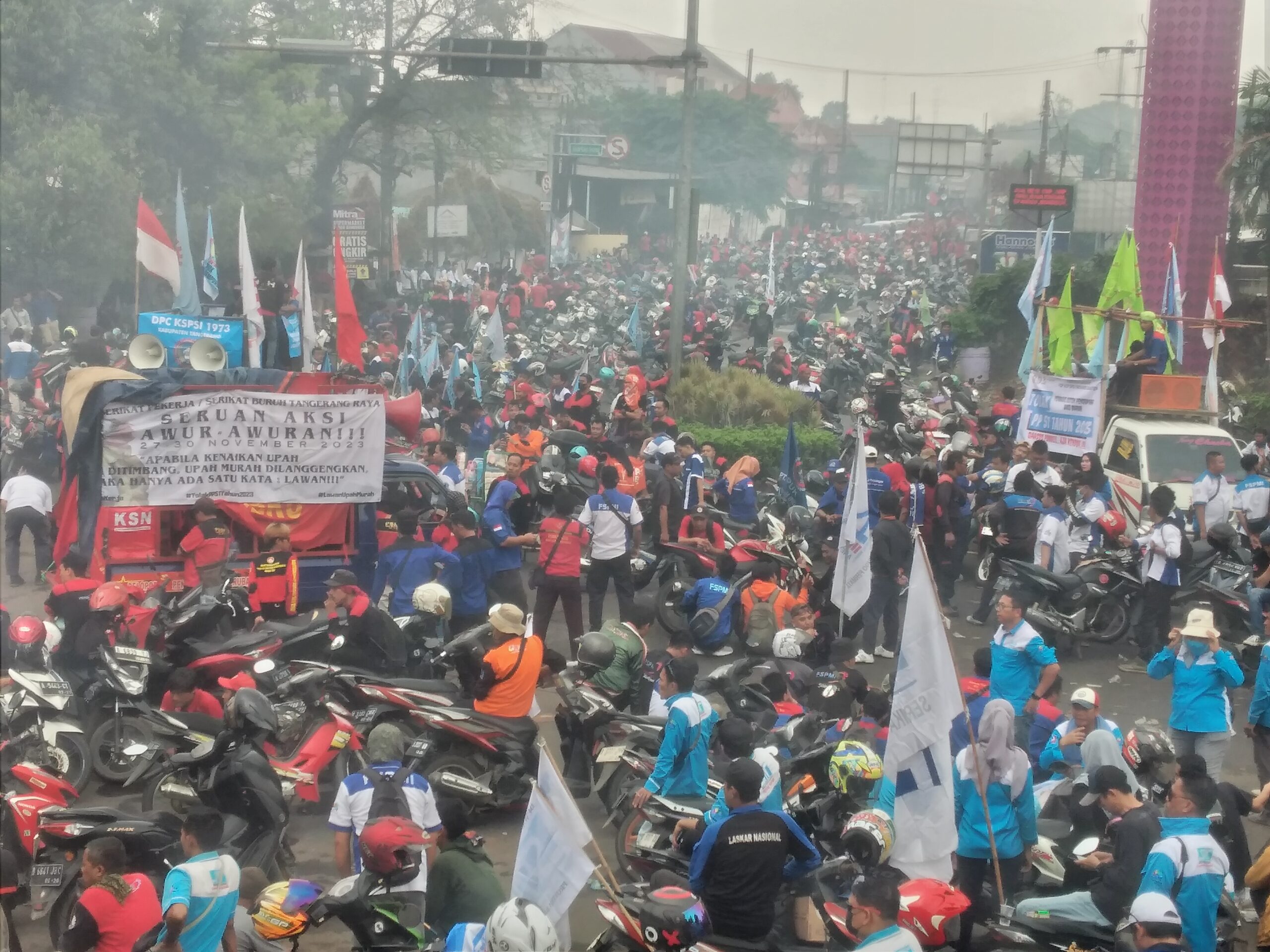 Sebelumnya koordinator Aksi Demo Buruh, Jayadi pada Senin (27/11/2023) saat menggelar aksi didepan kantor Bupati Tangerang menyatakan buruh akan melakukan aksi unjuk rasa secara besar-besaran dan awur-awuran di beberapa titik ruas jalan raya.